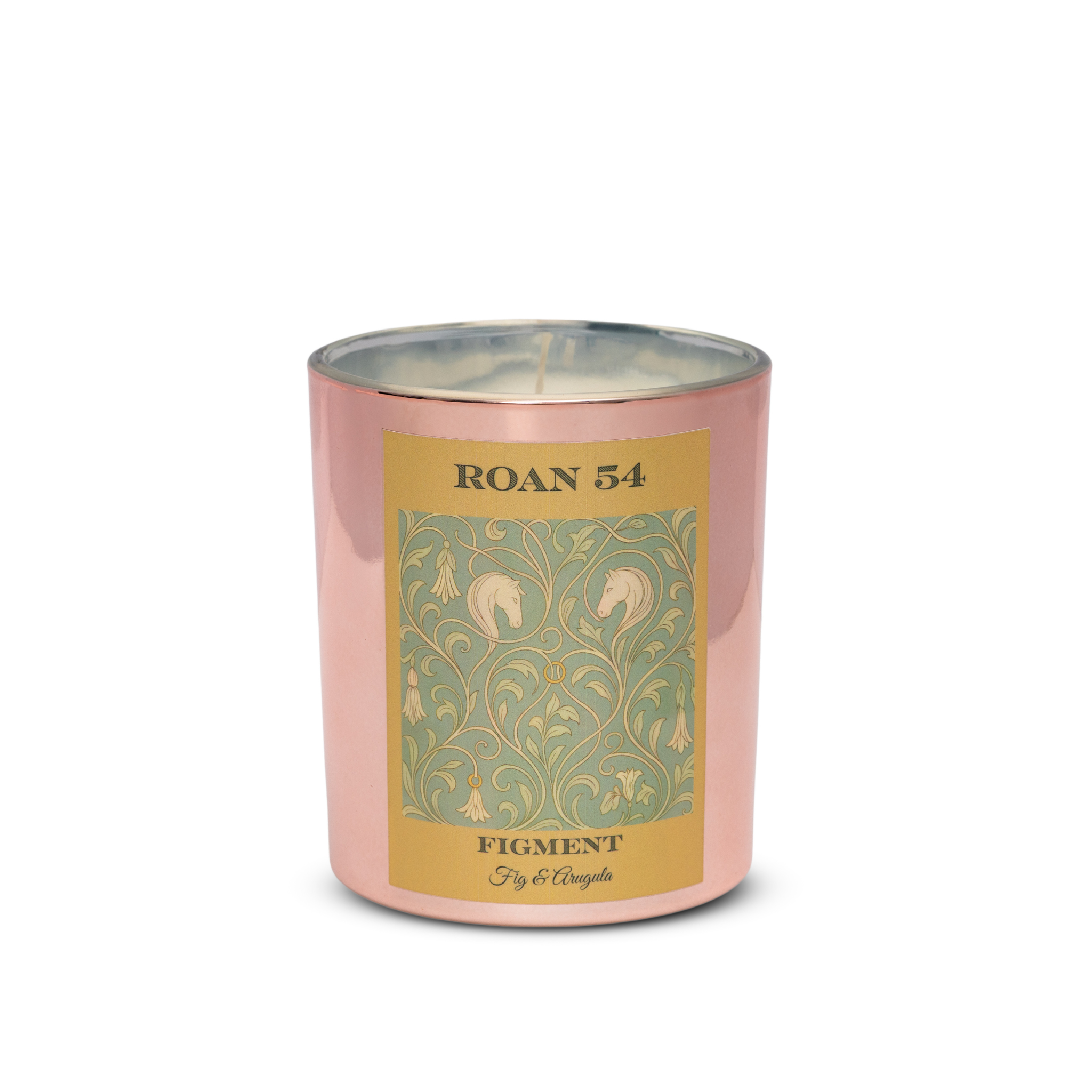 Each Figment candle is adorned with exclusive ROAN 54 artwork featuring mirrored horses entwined in flowing, Art Nouveau–inspired botanicals, rendered in a sage and antique gold palette that transforms the candle into a timeless, collectible design object.