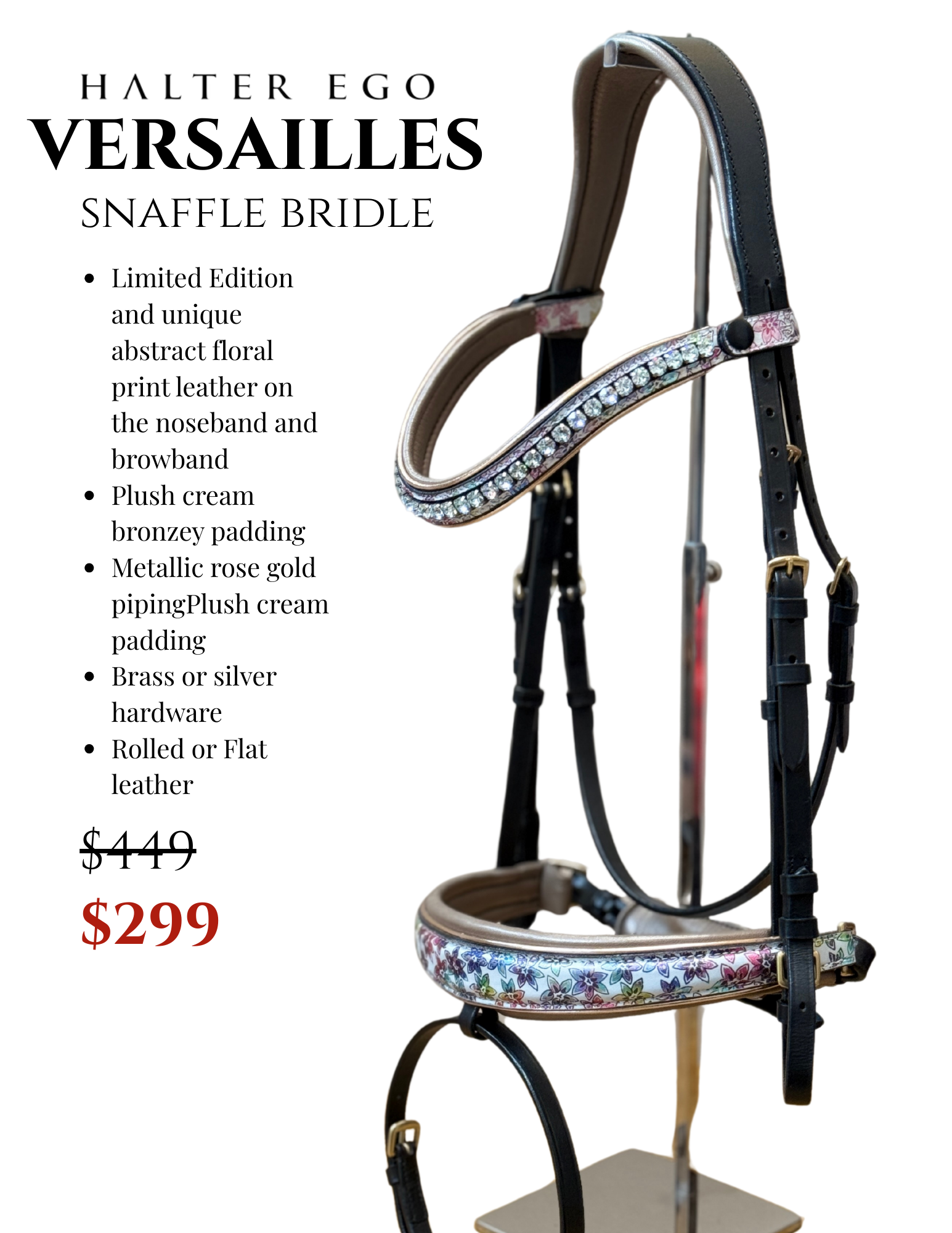 Featuring a very limited edition and unique abstract floral print leather on the noseband and browband, with plush warm cream bronzey padding and metallic rose gold piping to add just a touch of bling - this design is innovative, bold and classy - perfect for the discerning equestrian who likes to stand out from the crowd for all the right reasons!