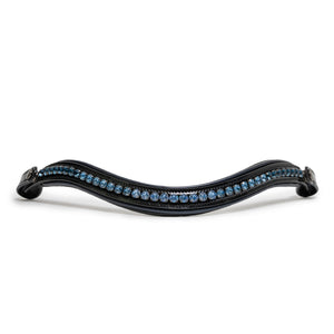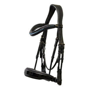 Beautiful black patent leather framed with midnight blue metallic piping on the noseband and browband accented with golden brass hardware and topped off with our stunning Blue Jean Ombre browband design.