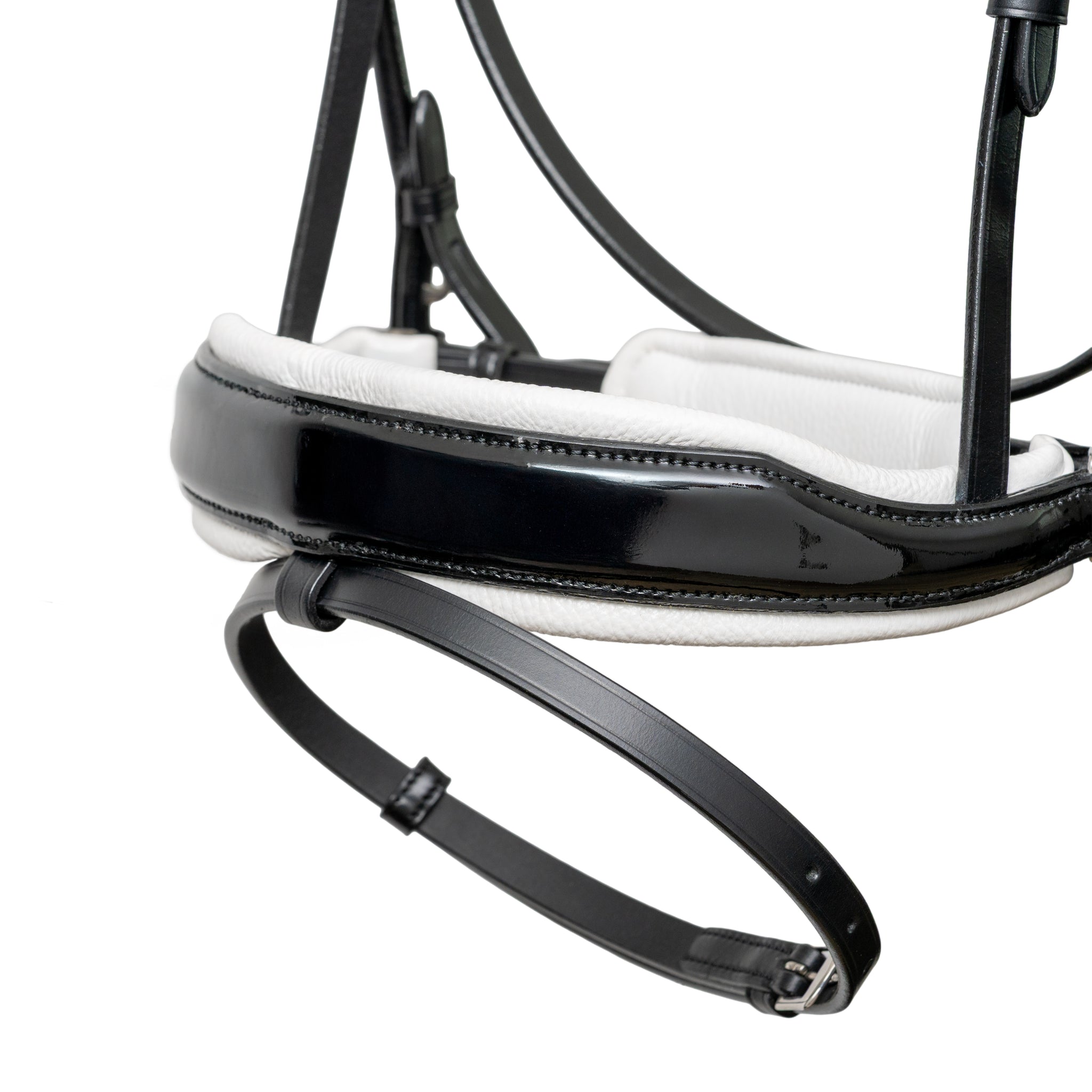 • Black patent leather noseband & browband with plush, soft white textured leather padding