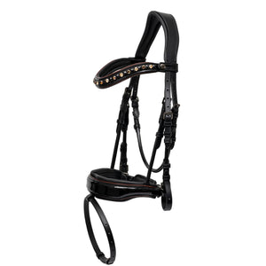 The Aachen Snaffle Bridle is a masterclass in refined equestrian style — blending the sleek lines of rolled leather with the warm glow of bronze accents and the sparkle of premium Austrian crystals.