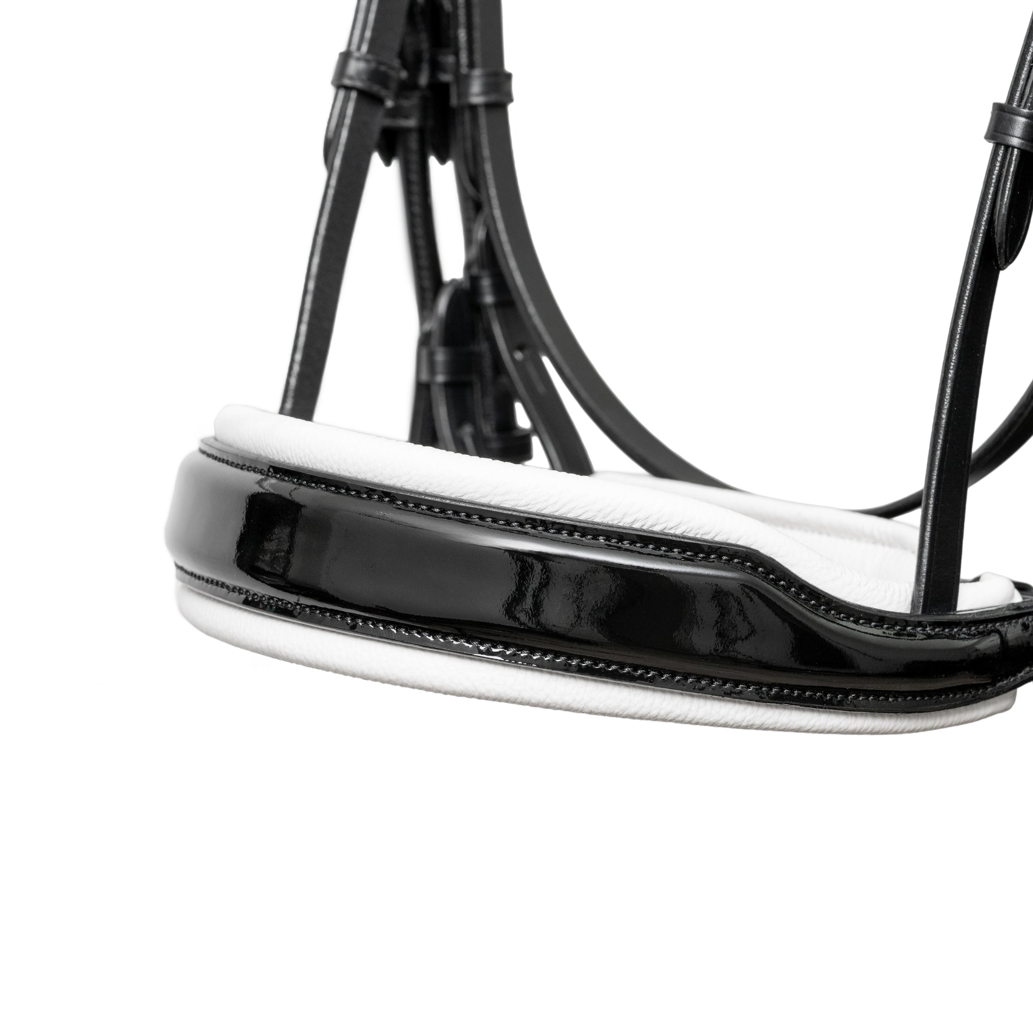 • Black patent leather noseband & browband with plush, soft white textured leather padding