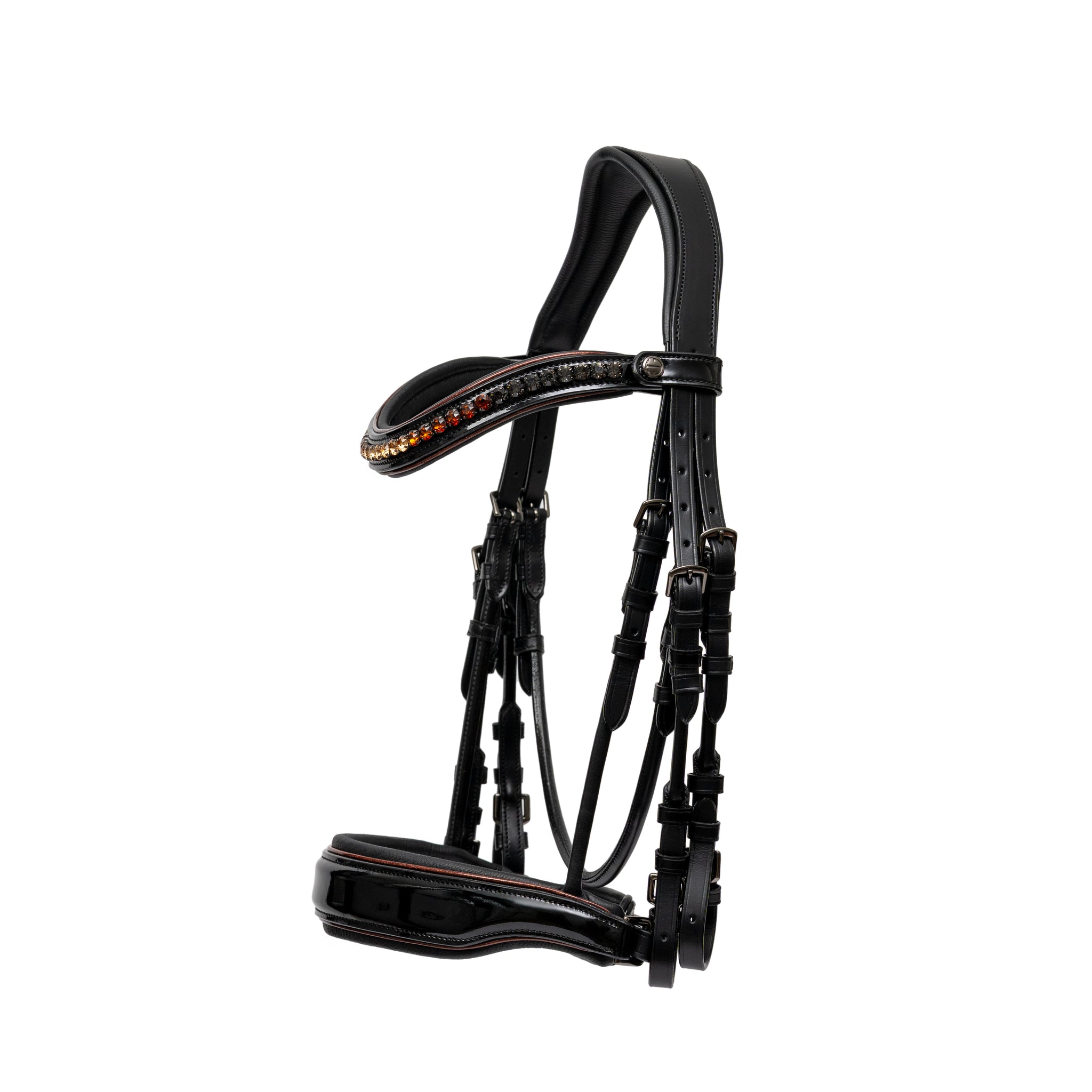 Black patent leather noseband & browband with black leather padding & metallic Burnished Bronze Sparkle Piping.