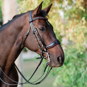 Featuring black patent leather complemented by deep burgundy patent piping, and a matching limited edition crystal browband.