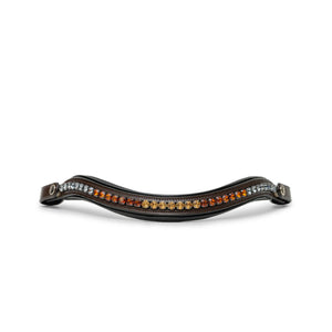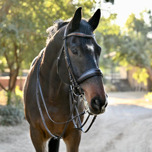 This double bridle is classic, chic, and timeless. Featuring Maple brown leather with Black Luxurious Black Nappa Leather Padding. The Ombré browband adds the perfect amount of bling to this classic design.