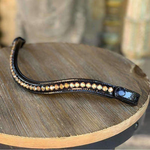 This stunning browband is made with a gorgeous sunny Gold Sheen crystal on black patent leather - A classy combination that suits Bays, Buckskins, and Chestnuts to a Tee!
