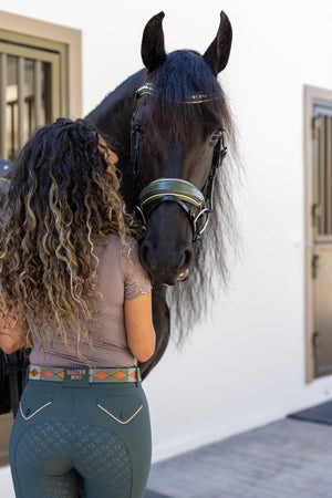 Spruce Green breeches with contrast metallic rose gold piping and logo embroidery