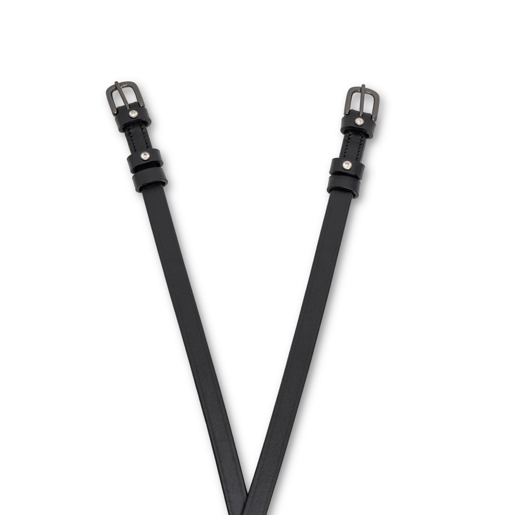 Designed to match our best selling Brixton Snaffle & Double Bridles, these black leather spur straps with black horseshoe shaped buckles & clear crystal rivets are the perfect accessory to tie in a chic and classic matchy-matchy look!