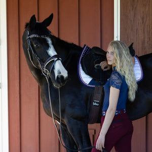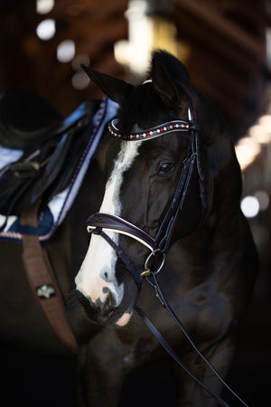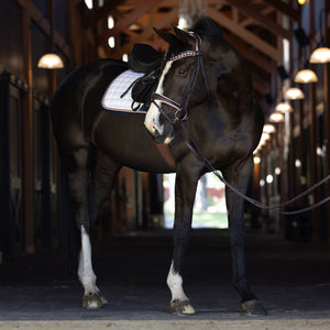Handcrafted and beautifully finished, the Liberty Jumper bridle features anatomically shaped browband and noseband in gorgeous, rich Navy Blue leather with plush white padding, red contrast stitching and a stunning browband made with limited edition coated crystals in shades of red, white and blue,