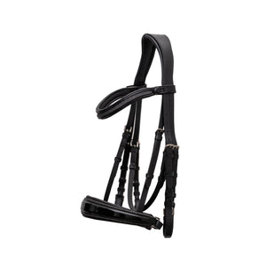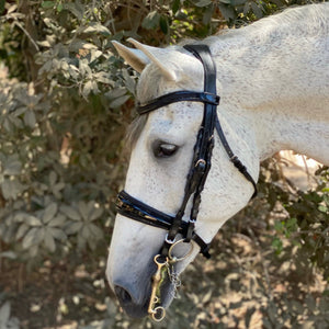 Featuring our tapered conical noseband design, black patent leather with black padding, paired with stunning black sparkle piping on the noseband and browband. This bridle is chic and classic!