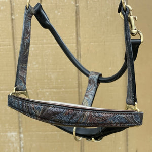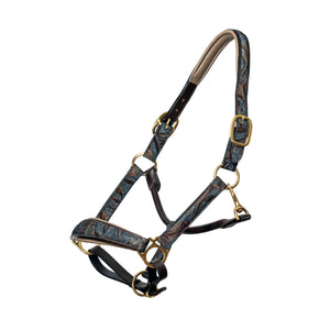 The Aspen Halter is truly one of a kind. Featuring a multicolor, intricate, shades of brown and montana blue, textured leather complimented by a warm taupe padding, and bronze patent piping. The plush anatomical noseband and crownpiece with cutouts alleviate pressure providing ultimate comfort for your horse.