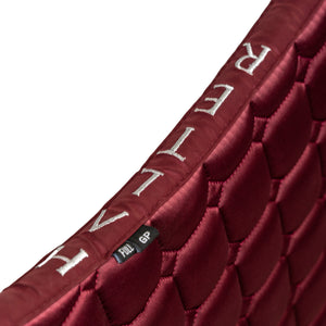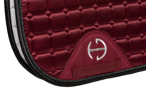 With its rounded edges, high wither design, geometric and diamond quilting pattern in rich crimson burgundy hues accented by ebony black and metallic black/silver satin rope trim- this pad is certain to turn heads!