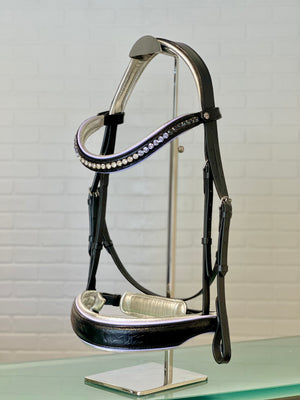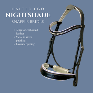 Featuring a very limited edition alligator embossed leather, metallic silver padding and lavender accents you will simply captivate in this unique snaffle bridle design.