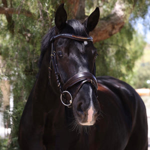 Featuring a gorgeous maple brown noseband with metallic navy padding, and bronze glitter piping. This bridle is sleek, edgy and includes a padded anatomical crownpiece specifically designed with your horse's comfort in mind.