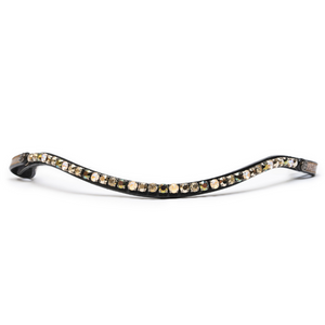 The Azteca Slimline browband features a dazzling array of limited edition burnished golds and bronze, gold patina, cream and metallic rose gold chaton crystals set in a metallic bronze croc slimline browband channel with our signature logo snap closures AND velcro reinforcements.