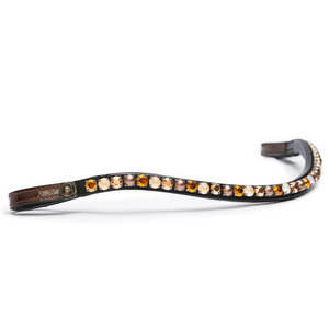 The Orange County Slimline browband features a dazzling array of limited edition burnished smoked topaz, metallic rose gold, bronze, cream and metallic rose gold chaton crystals and pearl cabochons set in a metallic bronze patent slimline browband channel with our signature logo snap closures AND velcro reinforcements.