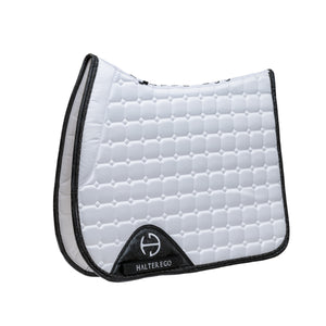 With its rounded edges, high wither design, diamond quilting pattern in sophisticated contrast of Bright White & Black framed by a subtle black and silver twisted rope trim, black tooled faux leather border and matching girth guard - this pad is a stunner!
